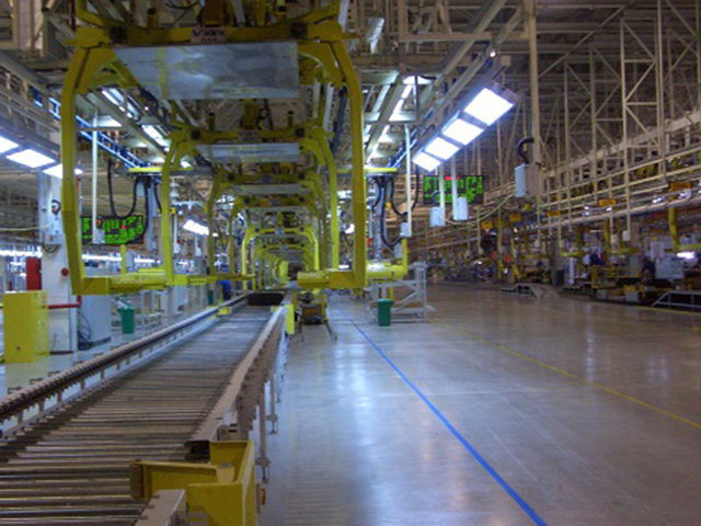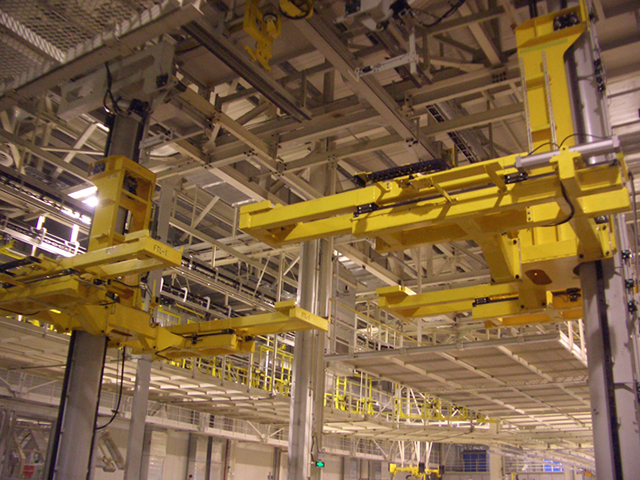 此項(xiàng)目總包方為日本大福,全線采用摩擦驅(qū)動(dòng)。空中儲(chǔ)存線和地面生產(chǎn)線采用斜坡鏈條銜接,車輛上下線為平臺(tái)升降機(jī)。生產(chǎn)工位高度變化要求通過走行軌的起伏變化實(shí)現(xiàn)。整個(gè)總裝的工藝布局與上汽臨港工廠基本類似。